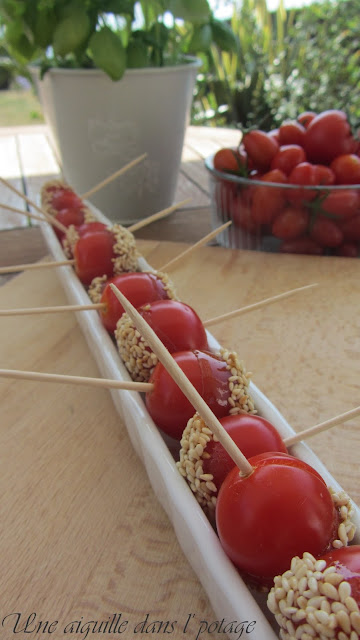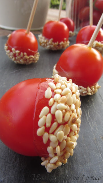 Trempez chaque tomate , l’ une après l’autre dans le caramel, puis dans le sésame en faisant un petit mouvement de rotation afin de bien recouvrir la partie caramélisée.