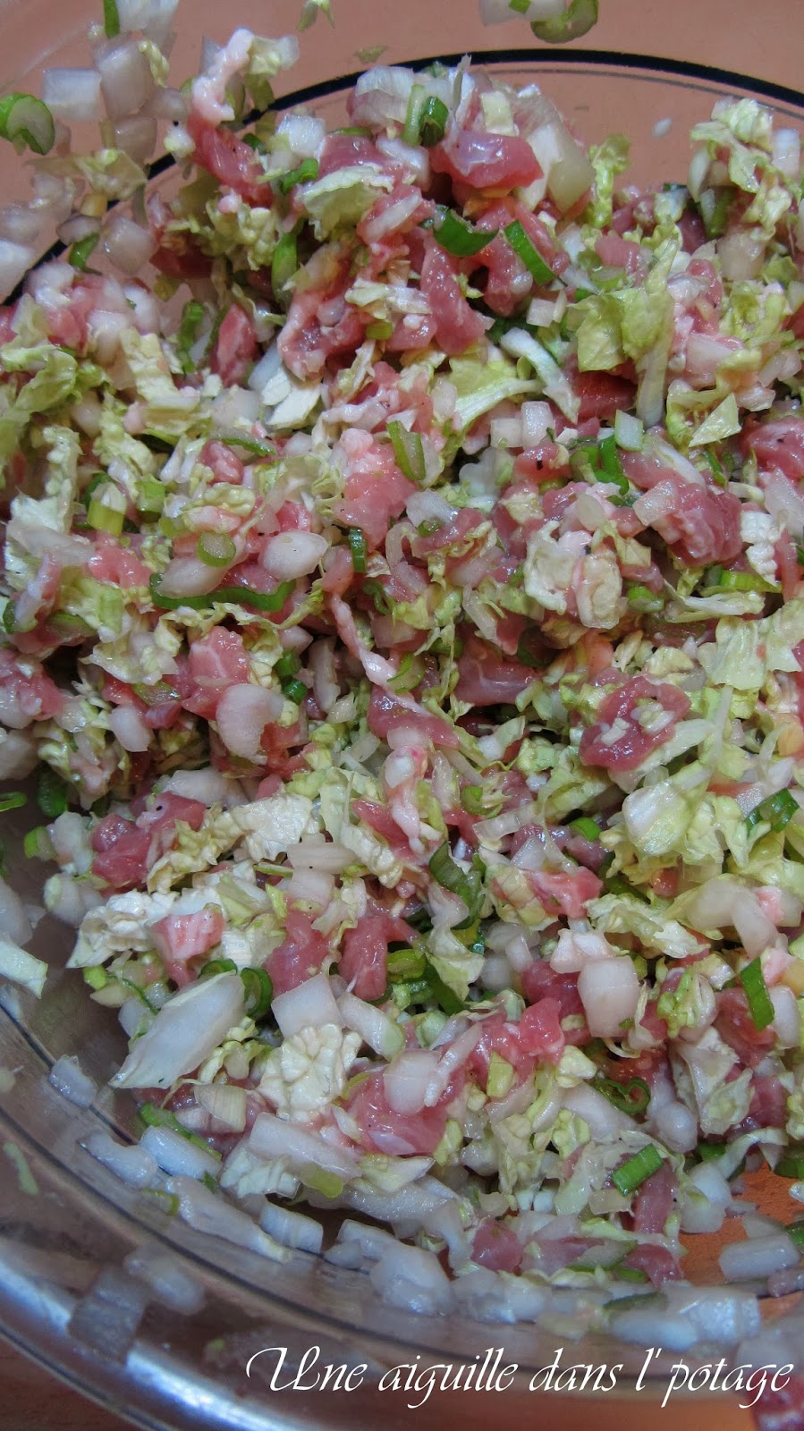 Mélangez la viande, le chou émincé, les ciboules, le gingembre haché. Ajoutez le sucre, le poivre et la sauce soja ; mélangez-bien le tout .