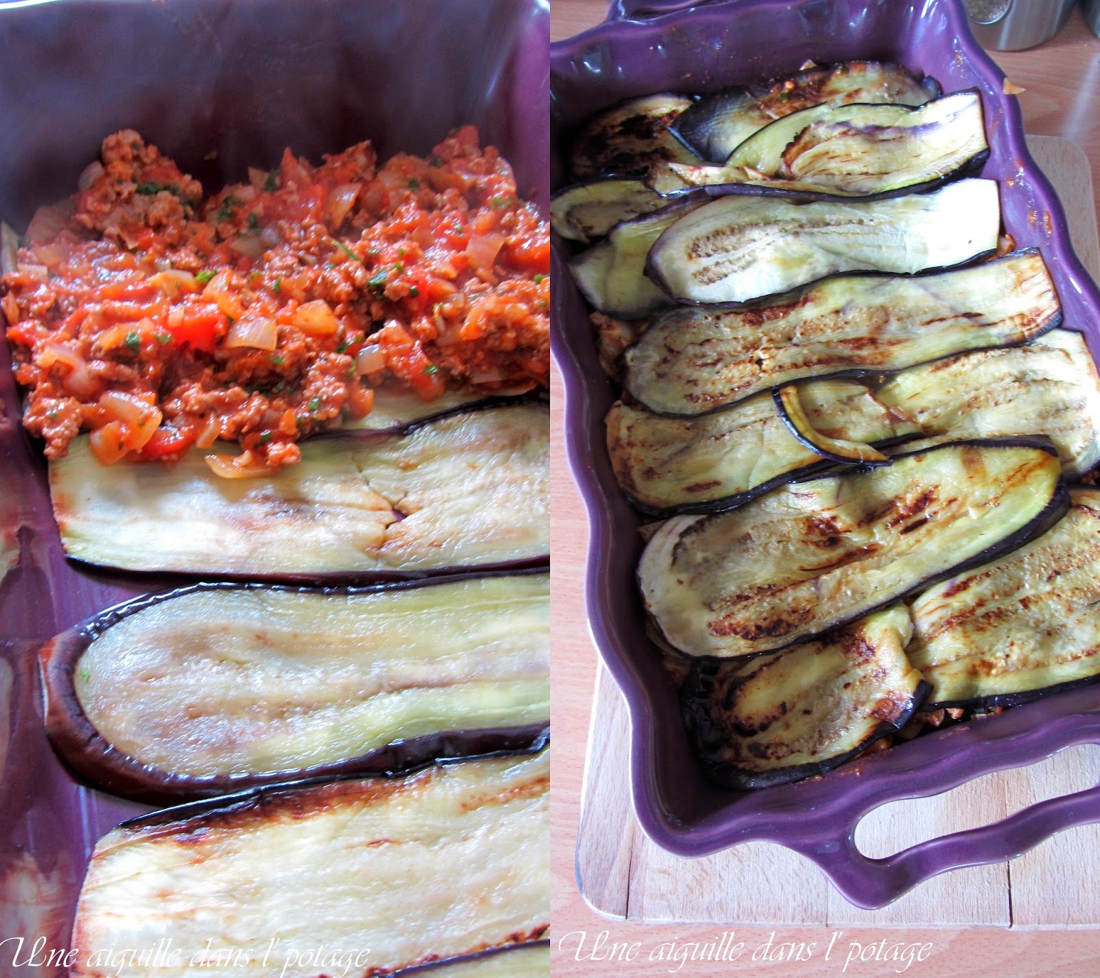 Dans un grand plat à gratin, disposez une première couche d’aubergine, recouvrez de la moitié du hachis (ôtez la feuille de laurier !), puis renouvelez l’opération en terminant par une couche d’aubergine .