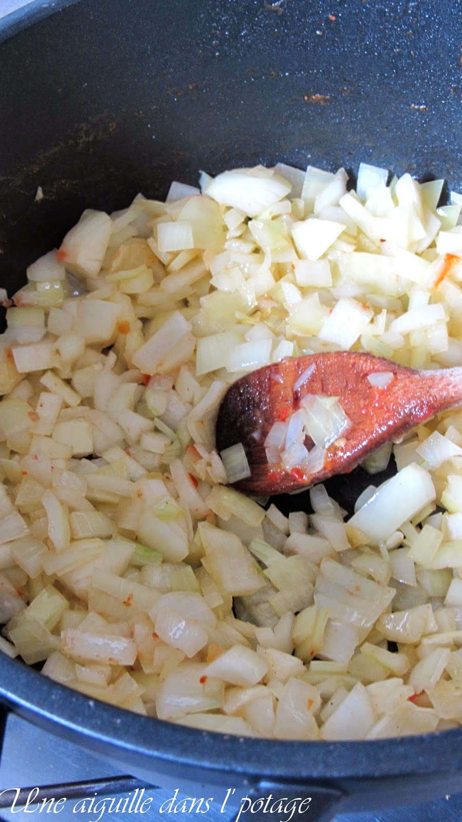 Dans une poêle, faites revenir l’oignon haché dans 2 c à s d’huile d’olive à feu vif pour les griller légèrement. Ajoutez l’ail haché . Réservez.
