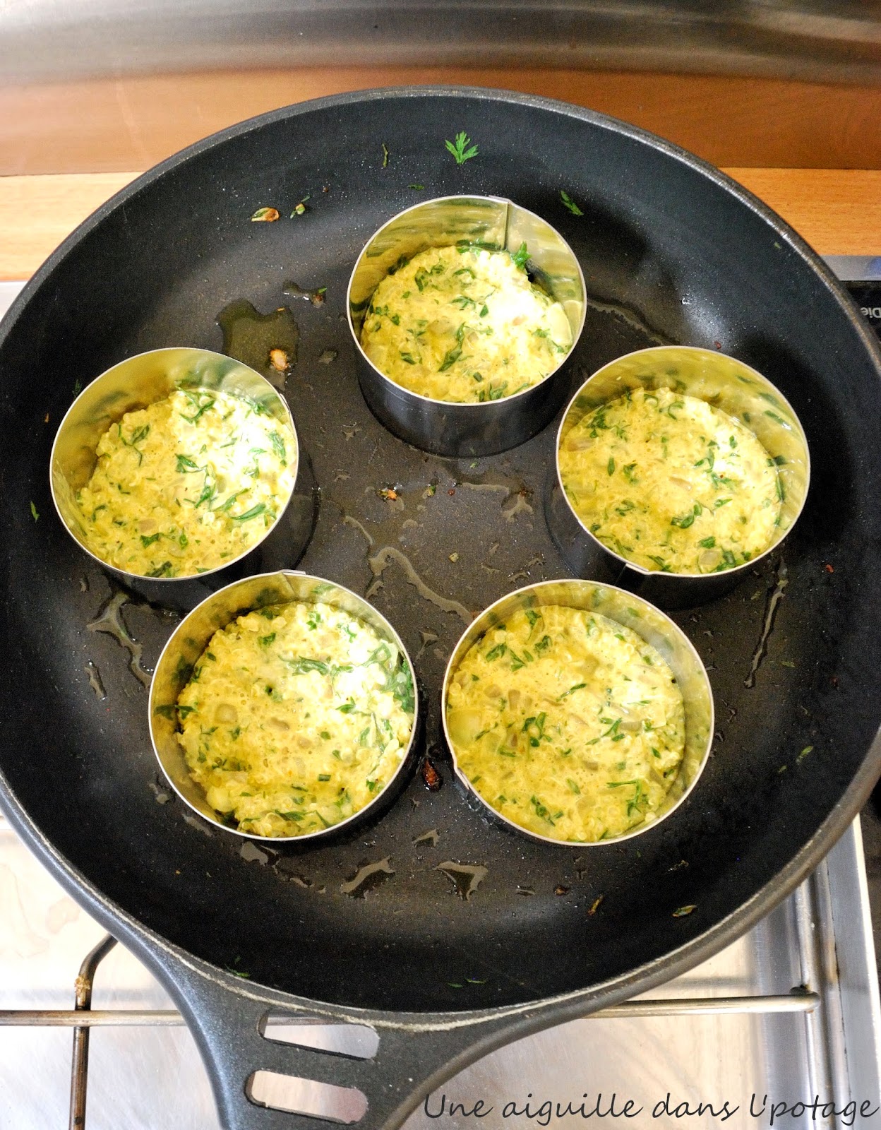 J’ai utilisé des cercles à pâtisserie inox de 7,5 cm pour obtenir des galettes régulières. Il faut dans ce cas huiler légèrement les bords intérieurs des cercles et utiliser une pince pour les retirer sans se brûler ( aidez-vous d’une cuillère pour pousser la galette si celle-ci accroche un peu ).
