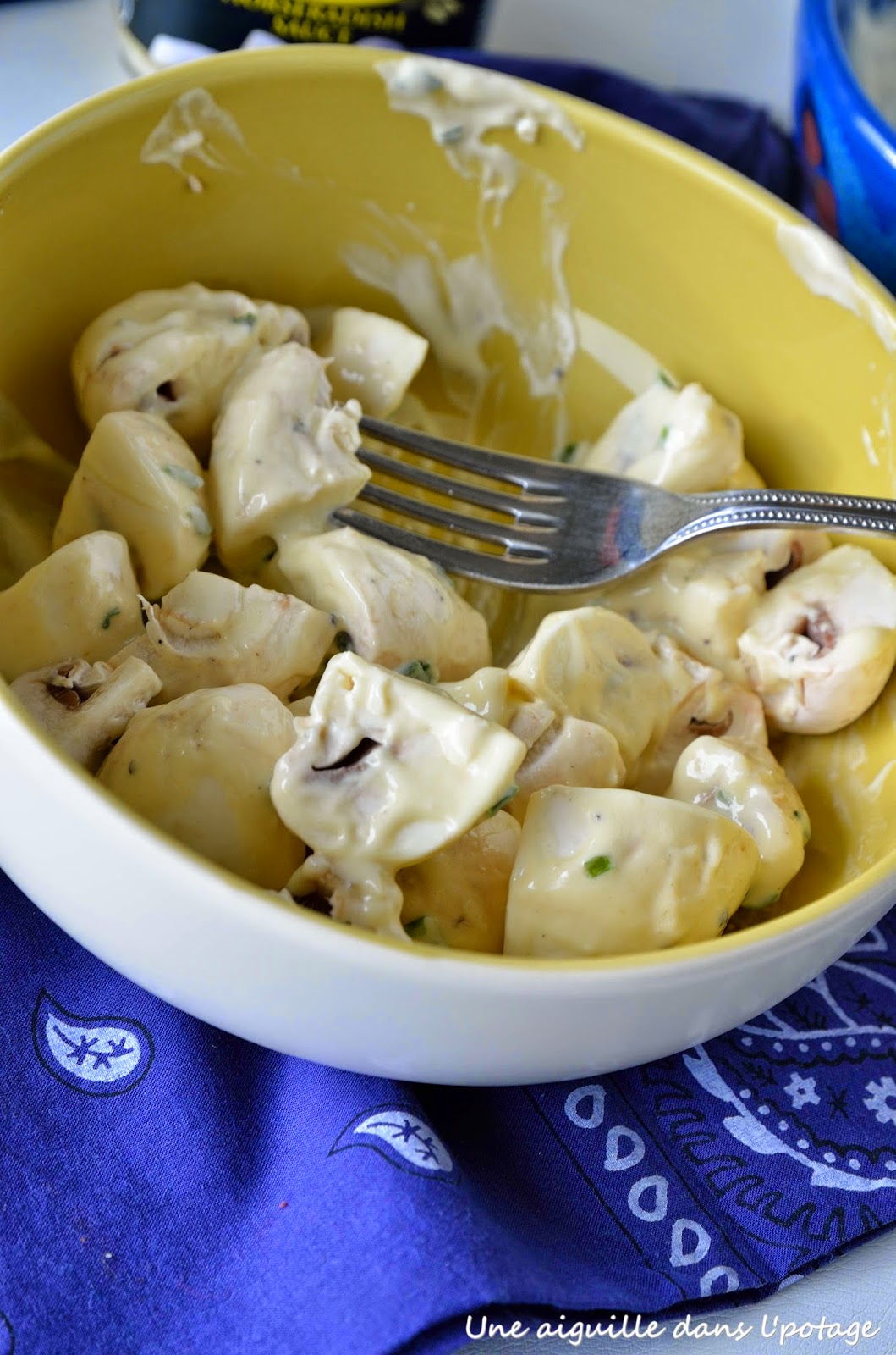 Ah oui c'est extra les salades de champignon crus ! Je ne connais pas cette sauce mais je devine que c'est excellent !