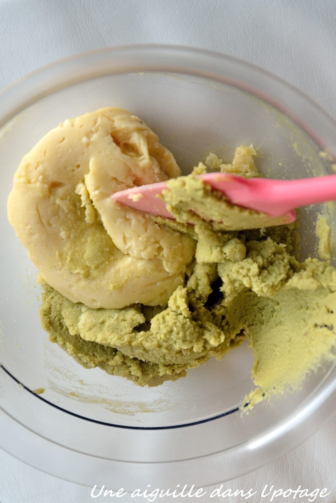 j’ai choisi le parfum de pistache car la couleur du pois cassé s’y prête bien, mais rien ne vous empêche de parfumer votre galette avec un peu d’extrait d’amande amère, des zestes de citron, etc …