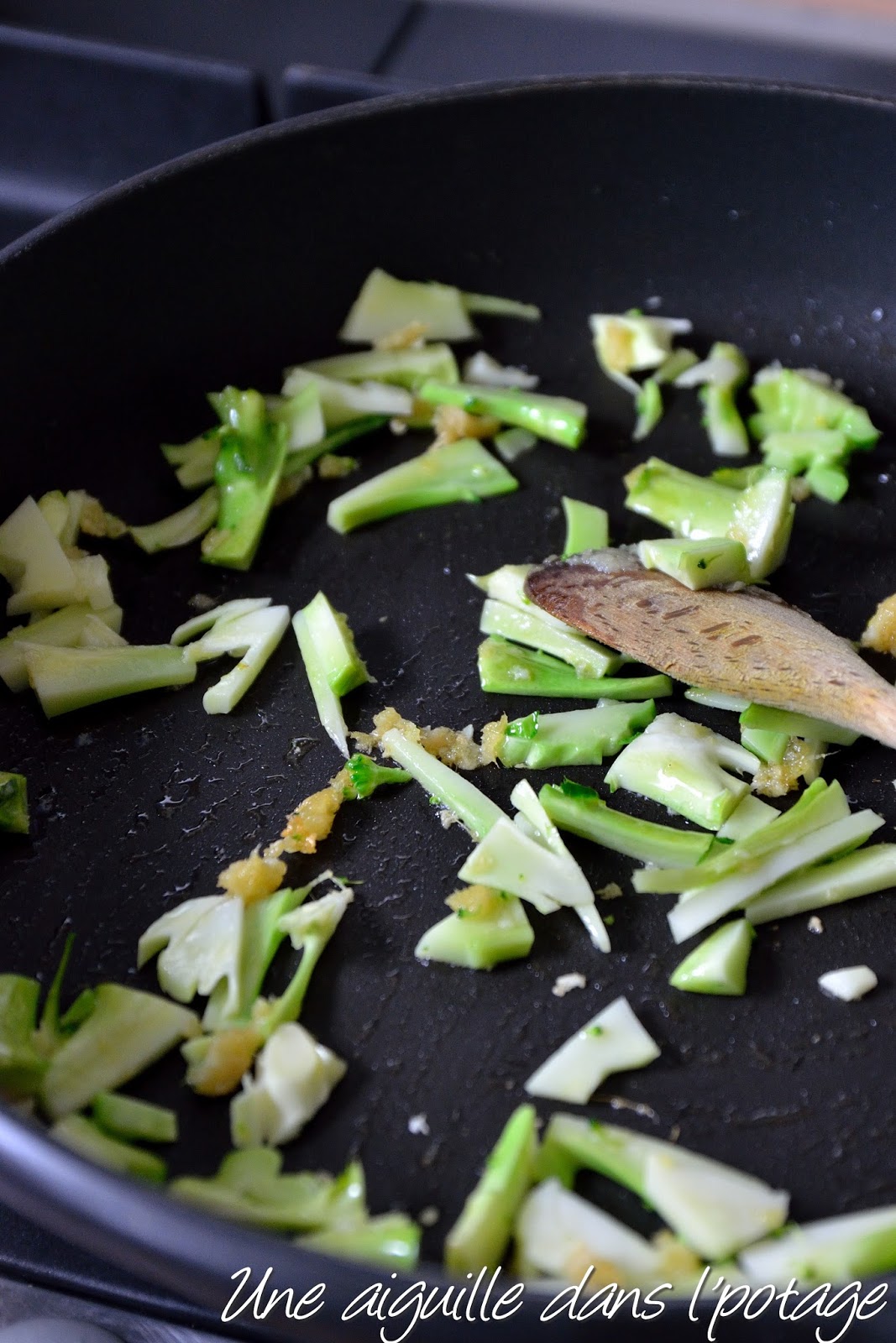 Couvrez et faites cuire à feu vif, environ 5 minutes, jusqu’à ce que le brocoli soit encore ferme, mais facilement transperçable par la pointe d’un couteau.