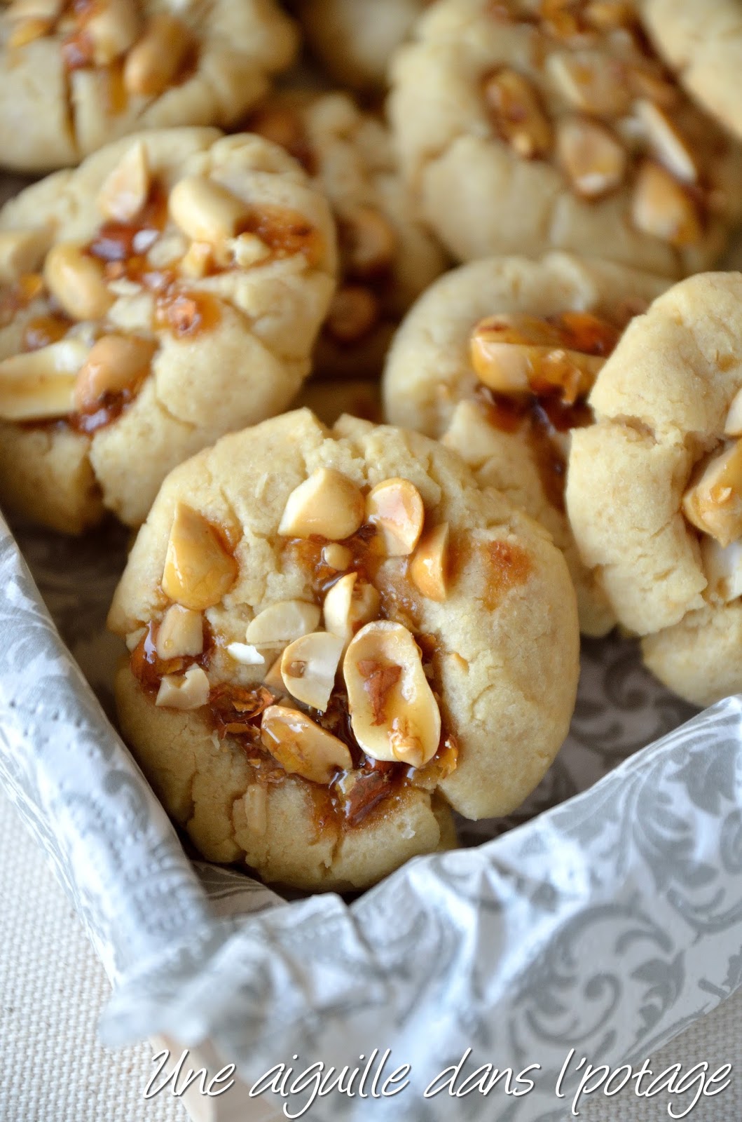 Les cookies aux noisettes, amandes ou cacahuètes, sont mes préférés car j’aime le croquant des fruits secs. Ici, les cookies sont crousti-fondants ; le croquant des cacahuètes est majoré par la fine couche de caramel qui les enrobe.