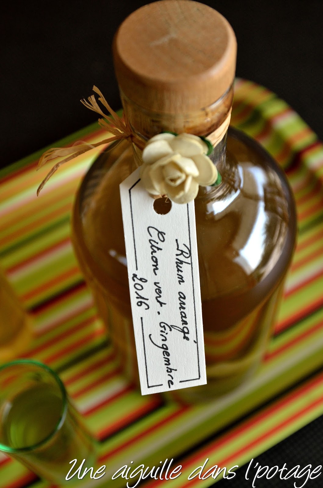 Ce rhum arrangé citron vert-gingembre a déjà 3 mois, mais je n’en verrai pas la couleur car il est destiné à être offert. Je me contenterai donc en attendant de sa bonne odeur acidulée!