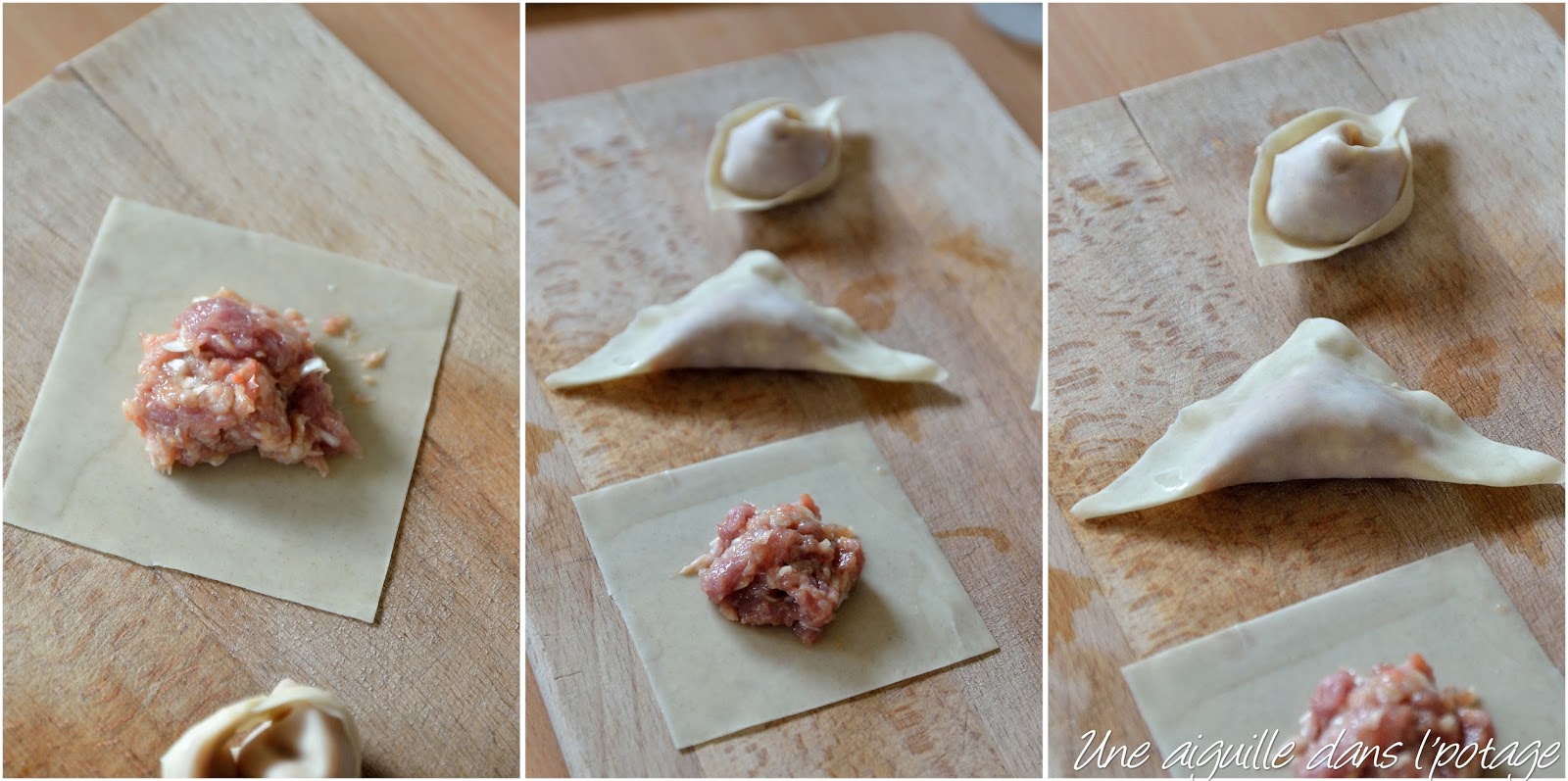 Déposez 1 c à c de farce au centre d’une feuille won ton. Humecter légèrement d’eau le pourtour de la pâte et replier celle-ci pour obtenir un triangle. Humecter les deux pointes opposées, les replier et les fixer au centre. Lors de la fermeture du wonton, l’air est soigneusement extrait pour éviter pour éviter la rupture du ravioli durant la cuisson.