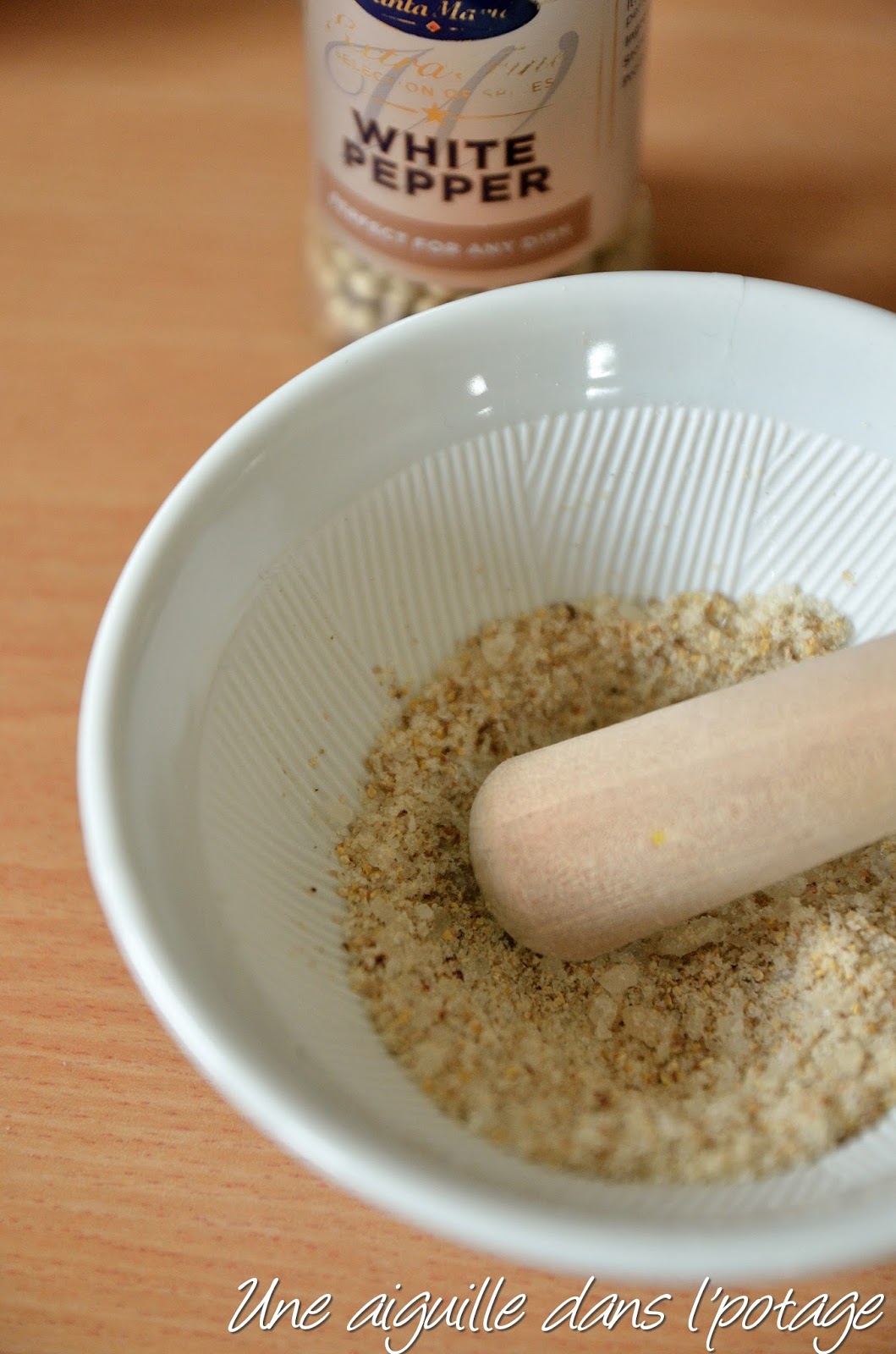 La prochaine fois, je remplacerai le poivre blanc par du poivre de Sichuan, préalablement torréfié. Quoique je lorgne déjà sur un tofu mariné dans une sauce soja à l’ail et au gingembre, avant d’être frit!