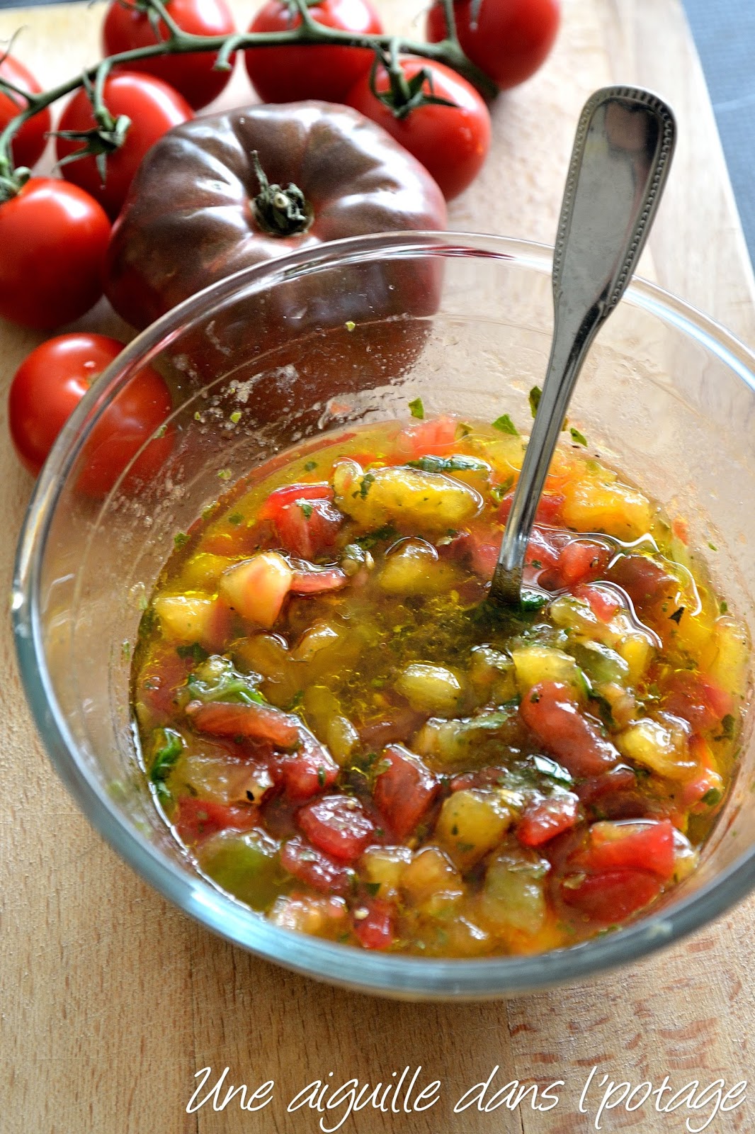 Il y a quelques jours, je vous proposais une belle salade de tomates multicolores, pico de gallo avec les tomates goûteuses de « ma corbeille de tomates » Prince de Bretagne; aujourd’hui, je vous propose une autre recette, un peu plus classique, mais tout aussi colorée, utilisant les tomates d’Antan ananas, vertes et noires, associées aux tomates grappes.Cette nouvelle recette, c’est la sauce vierge.