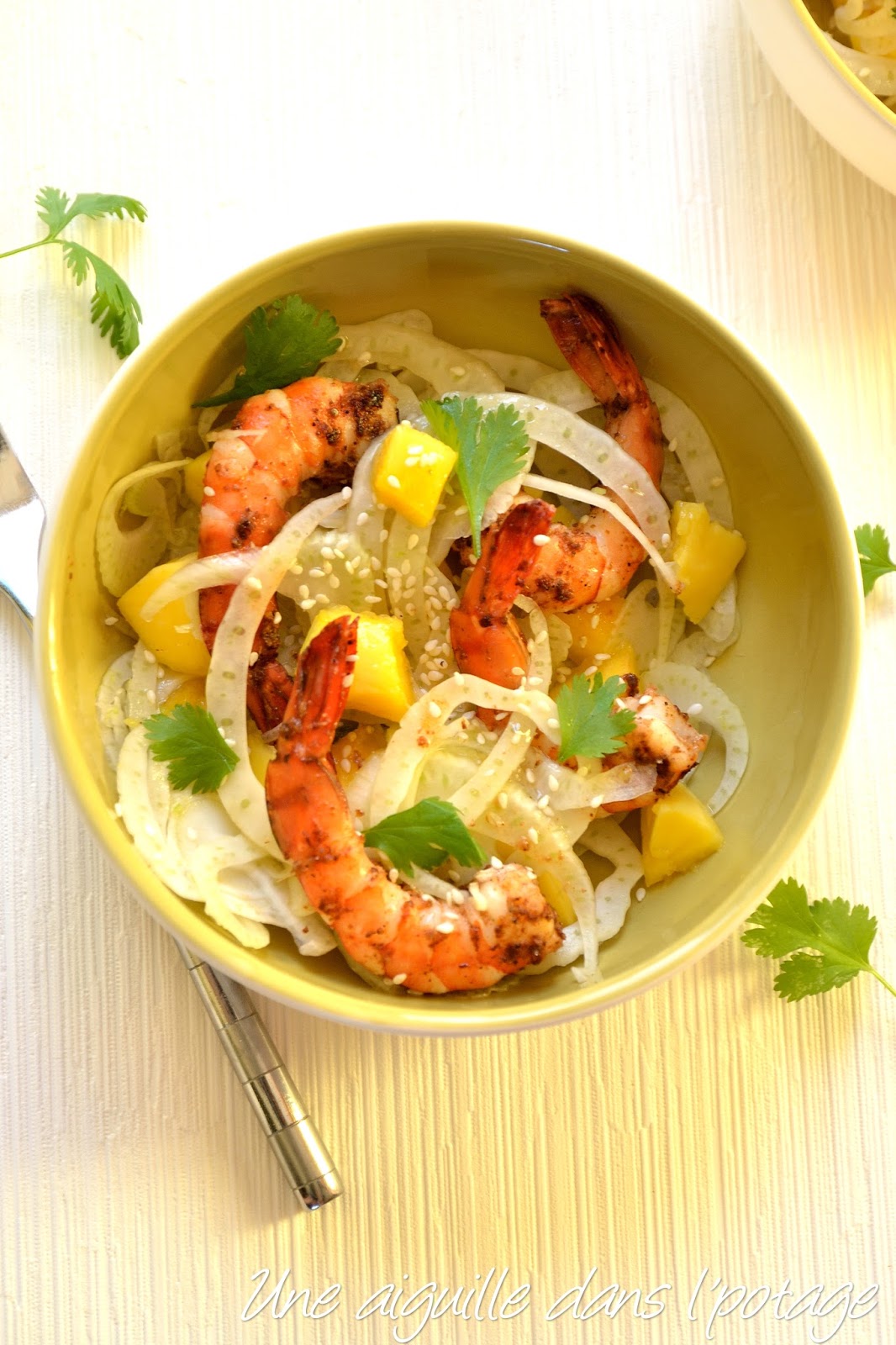 Je vous avais déjà proposé une salade associant fruits et fenouil, la salade de fenouil, grenade et féta . Les fruits, comme ici la mangue, apportent un peu de couleur au plat et se marient parfaitement au goût légèrement anisé du fenouil. Dans ce plat, ils offrent un bon contraste avec les épices utilisées pour cuire les crevettes.