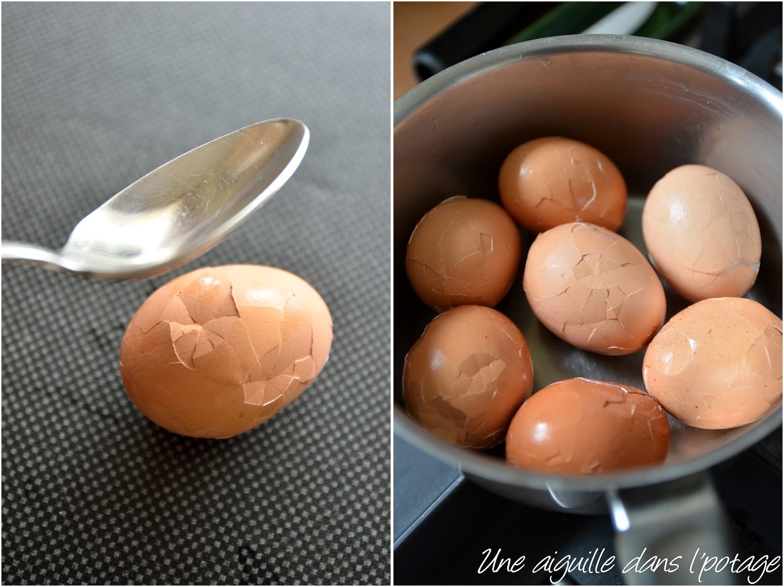 Avec le dos d’une cuillère, craquelez la coquille de chaque oeuf. Plus ils seront fendillés, plus l’effet de marbrure sera important.
