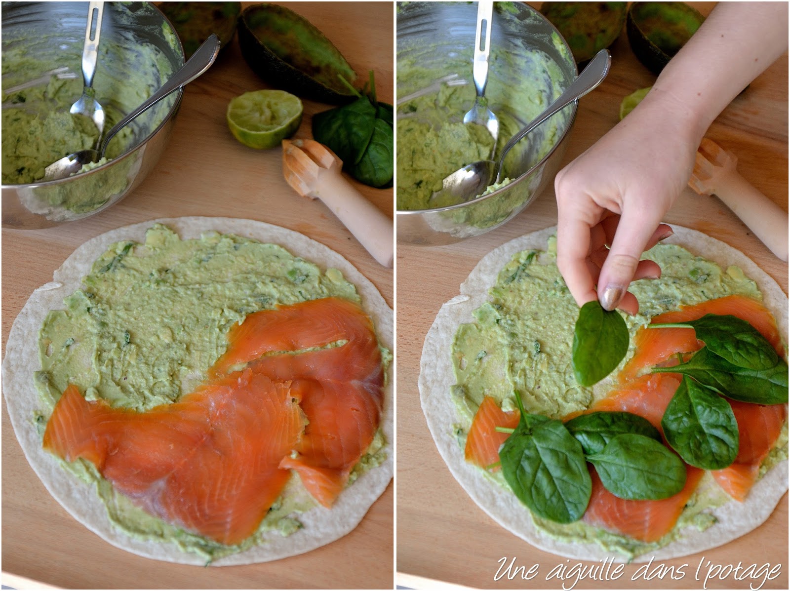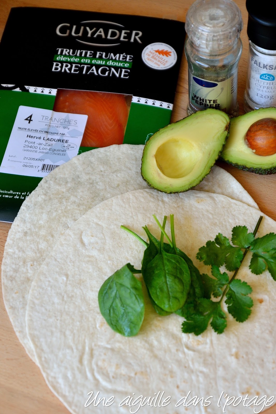 Les quantité sont données pour des wraps assez copieux, vous pouvez mettre un peu moins de poisson fumé; dans ce cas, coupez-le en lamelles et répartissez-les de façon homogène sur la purée d’avocat.