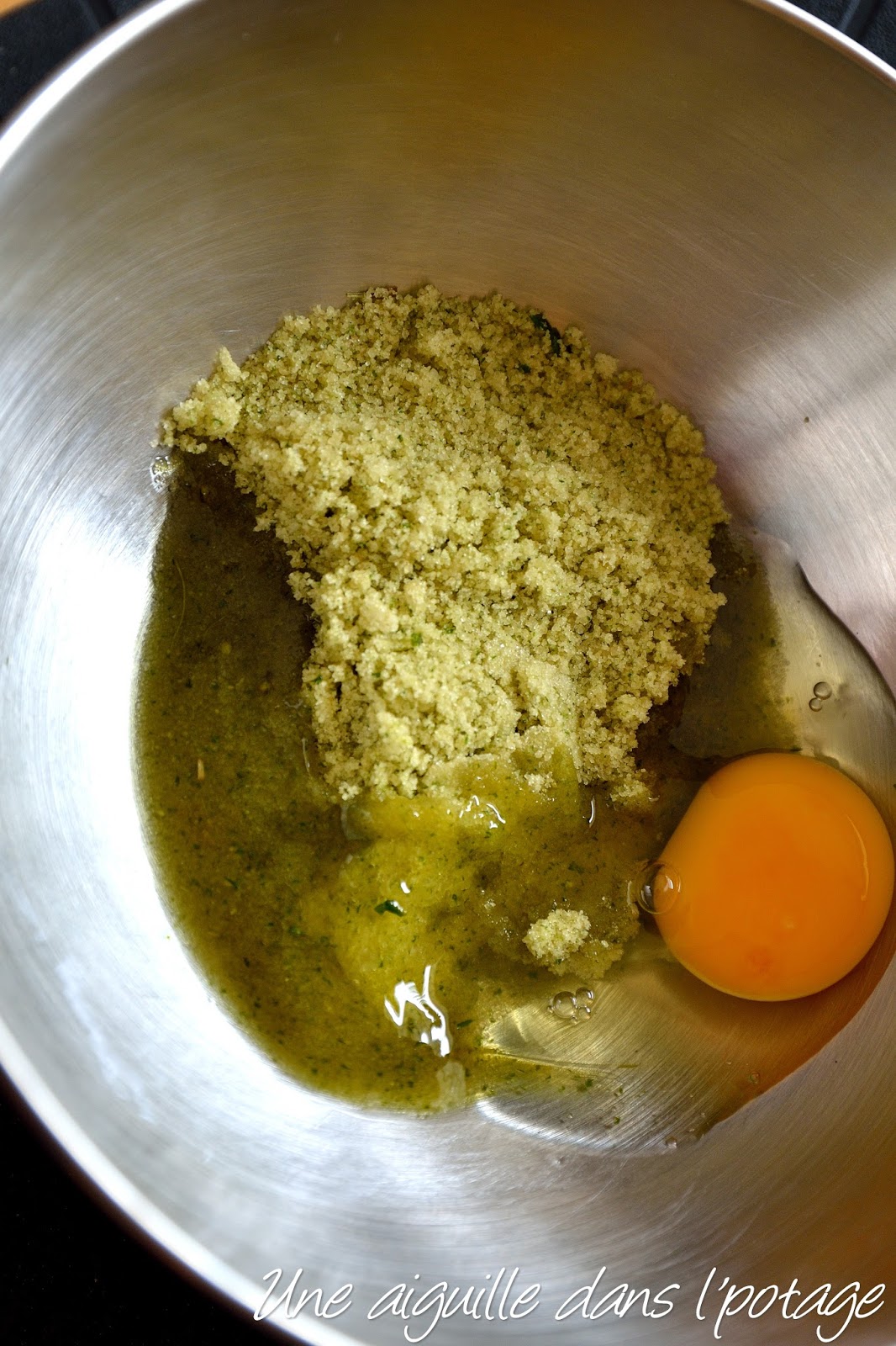 Battez rapidement les sucres aromatisés avec l’oeuf et la liqueur de menthe..