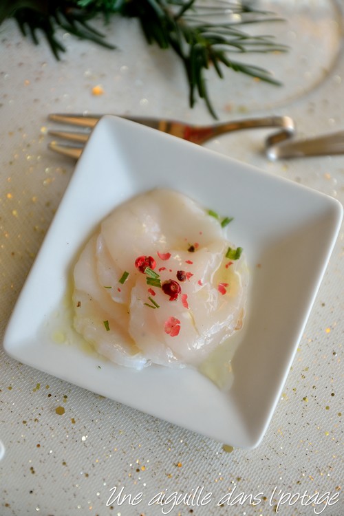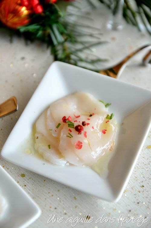 Aujourd’hui, je vous propose un carpaccio de St Jacques, un plat rapide à préparer, à servir en mise-en-bouche ou en entrée froide.