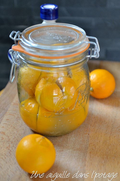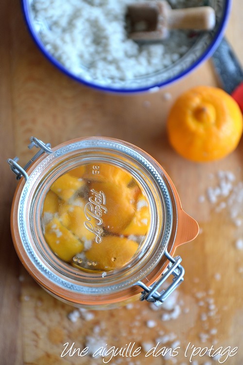 La recette peut se faire aussi en coupant les citrons en rondelle, en les mettant à dégorger au sel dans une passoire toute la nuit, puis en les tassant dans un bocal, avec de l'huile d'olive…..sans oublier quelques branchettes de thym, laurier, sur la paroi du bocal…… et 3 semaine après …..hum…