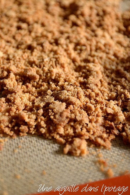 Sablez rapidement, du bout des doigts ou au robot, tous les ingrédients. Etalez le mélange sur un silpat et enfourner pour 10 à 15 mn, le streusel doit être doré et croquant. Laissez complètement refroidir avant de conserver dans une boîte en fer.