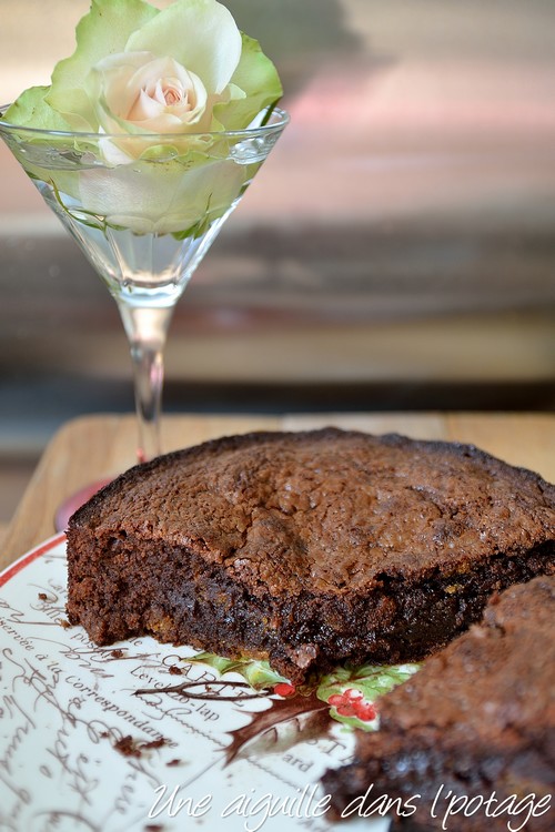 Pour le temps de cuisson, cela peut varier d’un four à l’autre et selon le plat utilisé. Je vous conseille de bien surveiller la cuisson; en fin de cuisson, le milieu du gâteau semble légèrement tremblotant. Un pic enfoncé en son centre doit revenir propre, avec quelques miettes de chocolat autour.