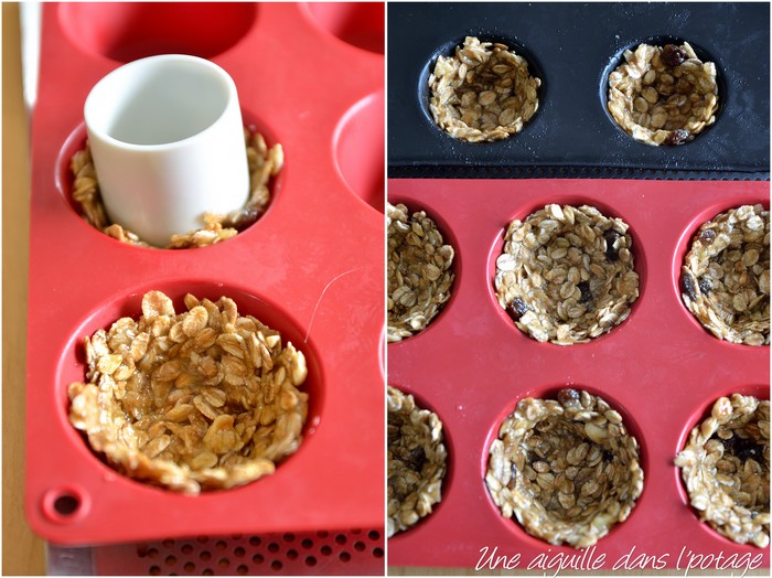 Versez une belle cuillère de granola dans vos empreintes, mouillez vos doigts et pressez légèrement le mélange de sorte de former une petite coupelle. Vous pouvez aussi vous aidez d’un petit verre. Entreposez 1 h au réfrigérateur.