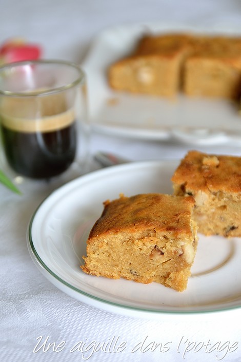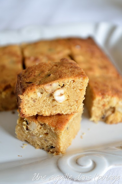 Un petit brownie pour le goûter, ça vous dit? Je vous ai préparé une adaptation de brownie avec du chocolat blanc, blond ici, car celui-ci est au chocolat dulcey, et avec des noisettes bien croquantes.