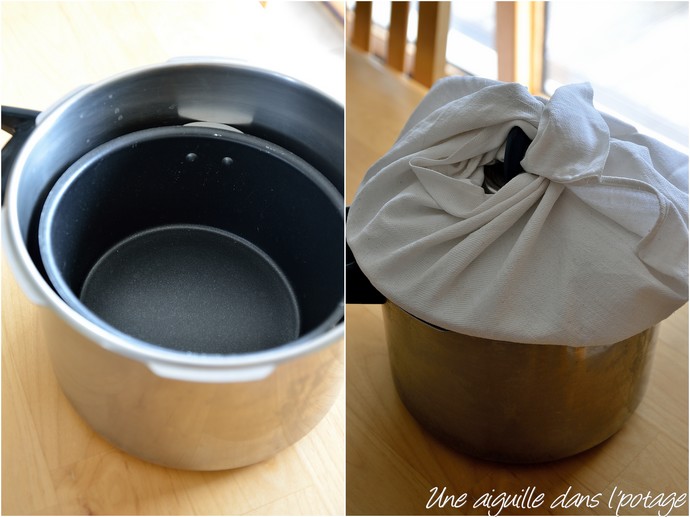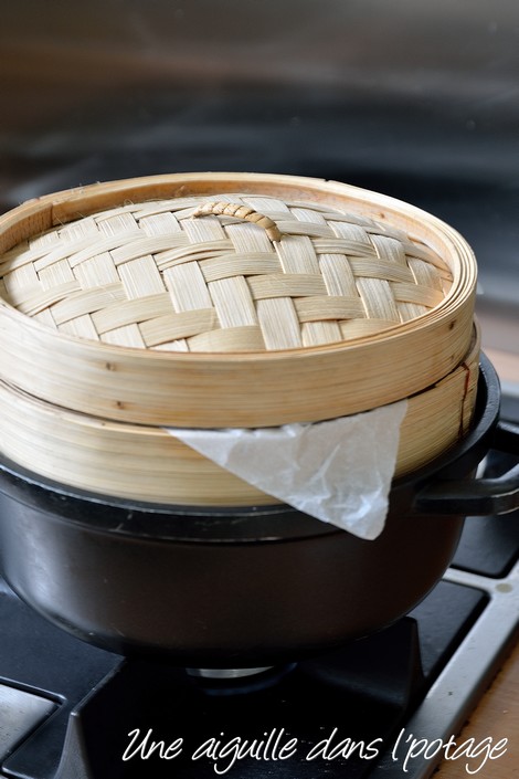 Si vous n’avez pas de panier bambou, pas de soucis, utilisez un moule à gâteau, surélevez-le par rapport à l’eau avec un ramequin par exemple et entourez votre couvercle d’un torchon pour éviter que la vapeur ne retombe sur le