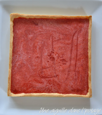 Coupez-le à la taille de votre fond de tarte en retirant 1 cm sur chaque bord. Déposez le biscuit sur la compotée de fraises.