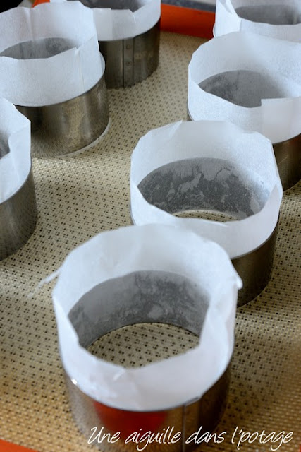 Beurrez 6 cercles en inox, et recouvrez l’intérieur de bandes de papier sulfurisé qui doivent déplacer d’au moins 2 cm.
