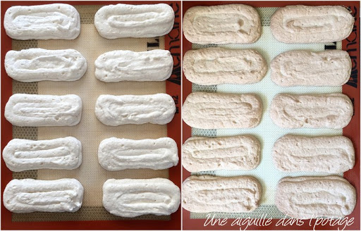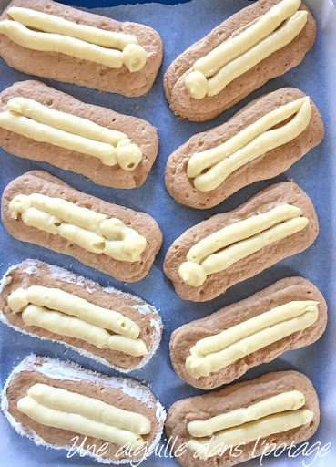 Dressez dans chaque moule (moule inox de 12 cm de long) une spirale de pâte de l’extérieur vers l’intérieur. Si vous n’avez pas de moule, pochez des rectangles de 10 cm sur 4 cm sur une plaque de pâtisserie recouverte de papier sulfurisé. (J’ai fait 2 couches de spirale avec la pâte et obtenu 13 rectangles, la prochaine fois, j’essayerai une douille de 1,5 cm ).