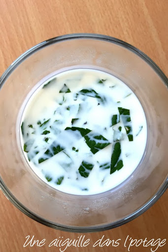 Crème pâtissière: la veille, ciselez la menthe fraîche et mettez-la à infuser dans le lait au réfrigérateur.