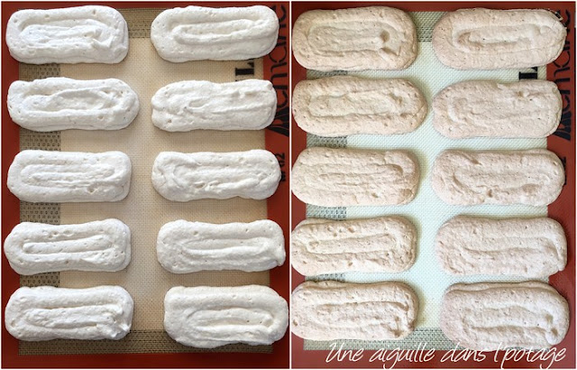 Revenons à notre gâteau: pour pocher la dacquoise, j’ai utilisé une poche à douille de 8 mm comme le disait Stéphanie; la prochaine fois, j’essayerai avec une douille de 15 mm, car j’ai du faire deux passages pour avoir une dacquoise assez épaisse.