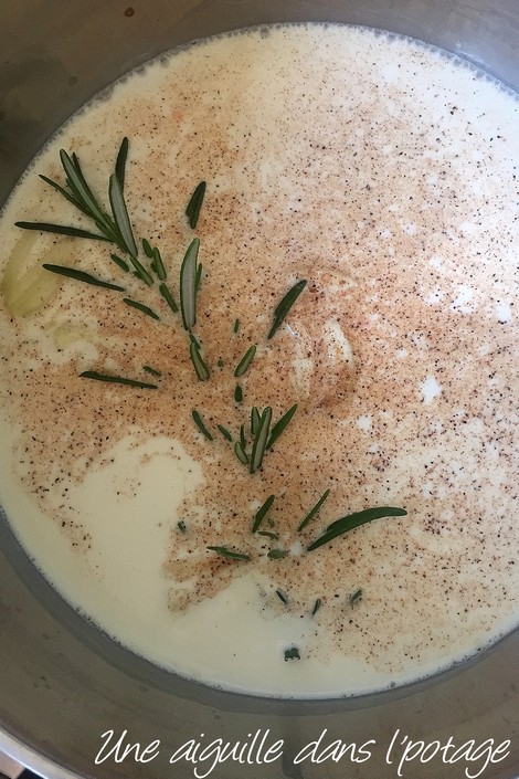 Faites bouillir le lait dans une grande casserole, ajoutez-y des gousses d ‘ail, du romarin, le bacon. Salez, poivrez généreusement et ajoutez de la noix de muscade fraîchement râpée et laissez infuser 15 min hors du feu.