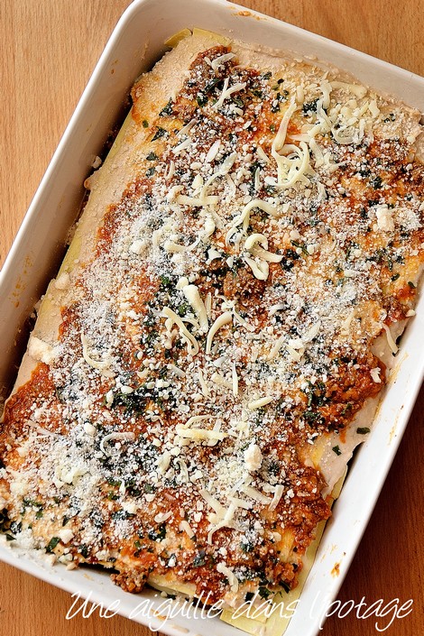 J’ai utilisé des pâtes à lasagnes fraîches du commerce; si vous réalisez vous même vos pâtes, ne les mettez pas crues dans le plat, mais blanchissez-les une vingtaine de secondes et refroidissez-les tout de suite à l’eau glacée.