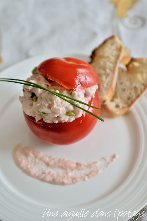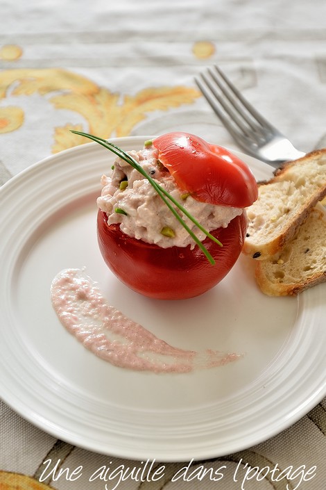 Les tomates farcies froides sont idéales en cette période de chaleur; elles sont une entrée parfaite, pleine de fraîcheur. L’association du thon et du tarama apportent des saveurs marines à cette entrée; le côté crémeux apporté par le tarama est contre-balancé par les dés de cornichon et les miettes de thon qui apportent un peu de croquant et de mâche. Ces tomates farcies ont été validées à la maison! Et vous, elles vous tentent?