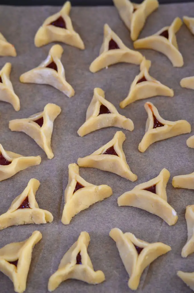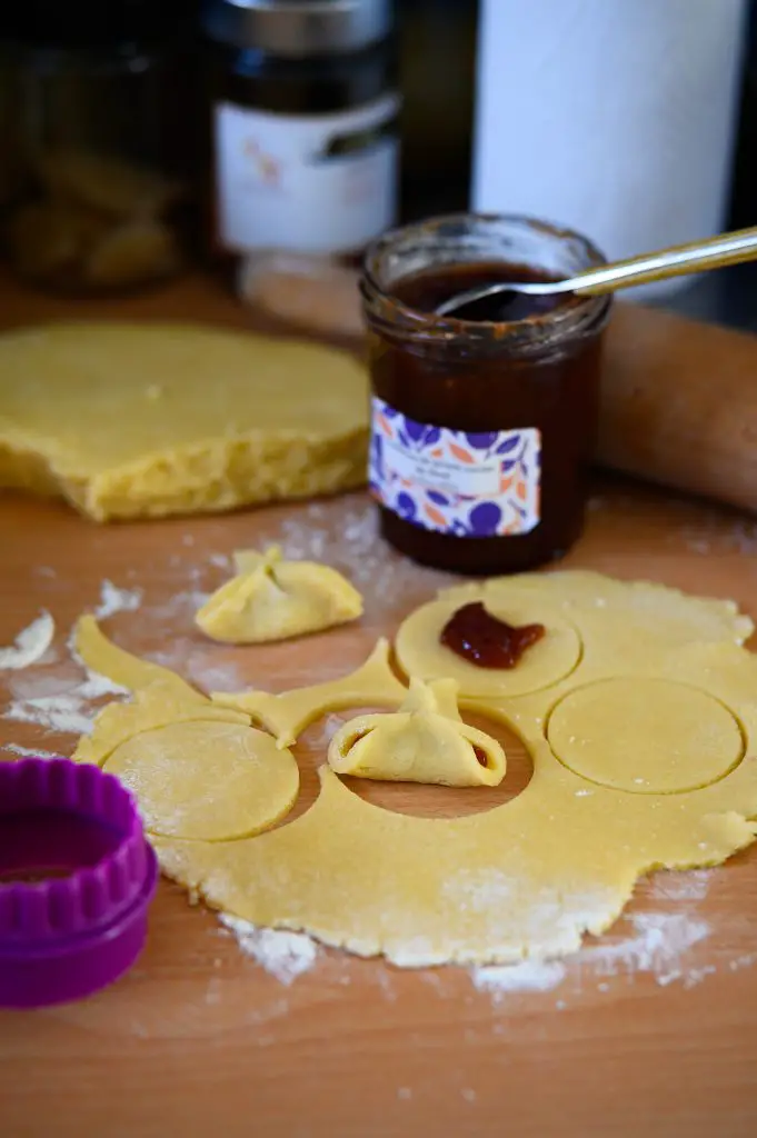 - Déposez une noisette de confiture au milieu de chaque rond de pâte puis formez les bonnets de moines en soulevant 3 bords et en les pinçant.