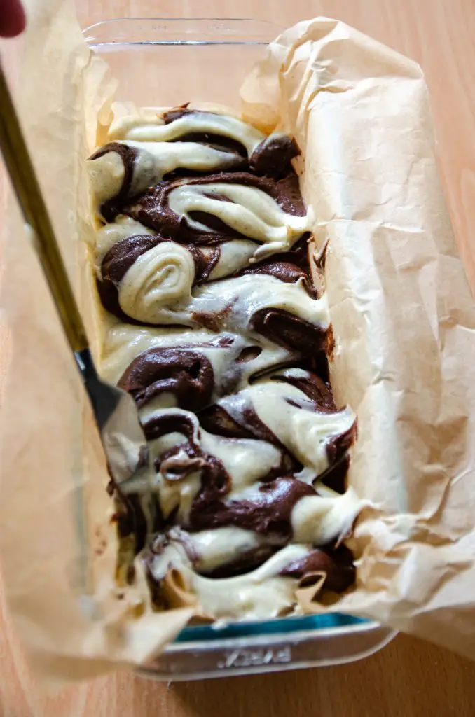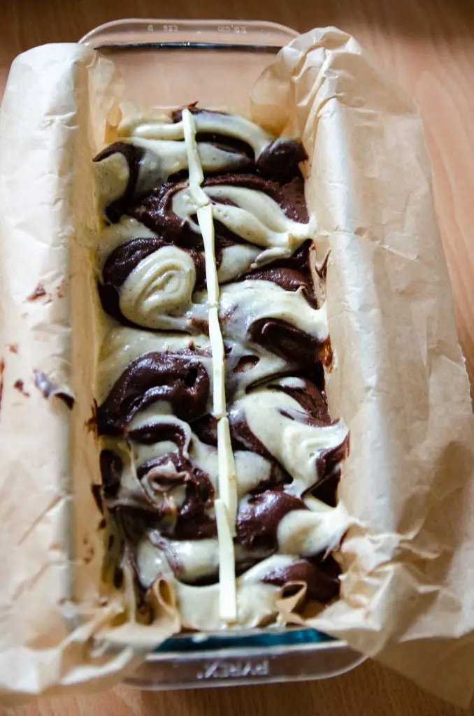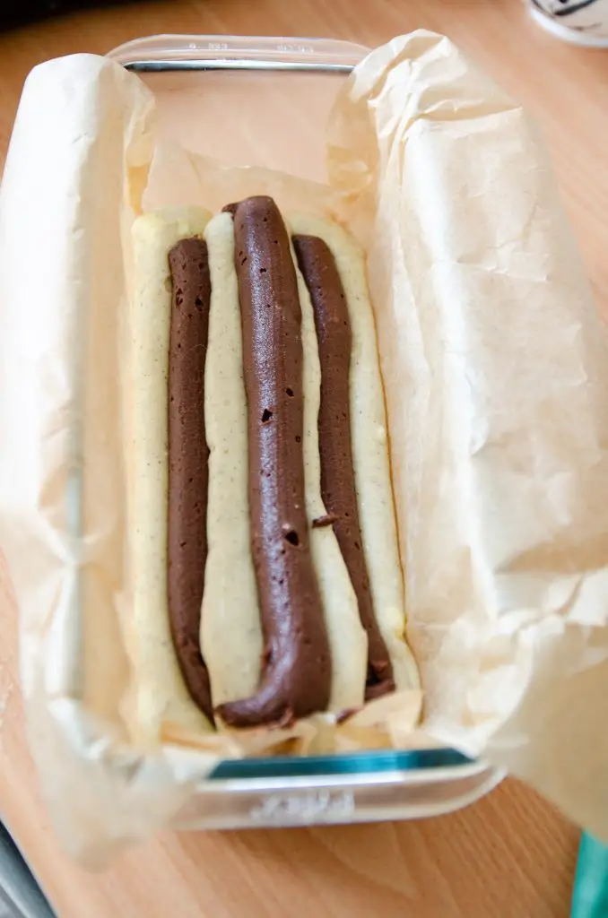 - Garnissez le moule à cake chemisé. Pochez un trait épais de pâte vanille au centre, sur toute la longueur du moule. Juste au-dessus, pochez un trait de pâte cacao. Continuez d'alterner (vanille, puis cacao, puis vanille…) en visant toujours le centre. La pâte va s'étaler naturellement vers les bords du moule sous son propre poids. Une fois tout le moule rempli, tapez fermement le fond du moule sur votre plan de travail pour chasser les bulles d'air et bien égaliser les couches. Avec un couteau, tracez des zig-zags réguliers sur toute la longueur du cake, sans jamais ressortir le couteau.