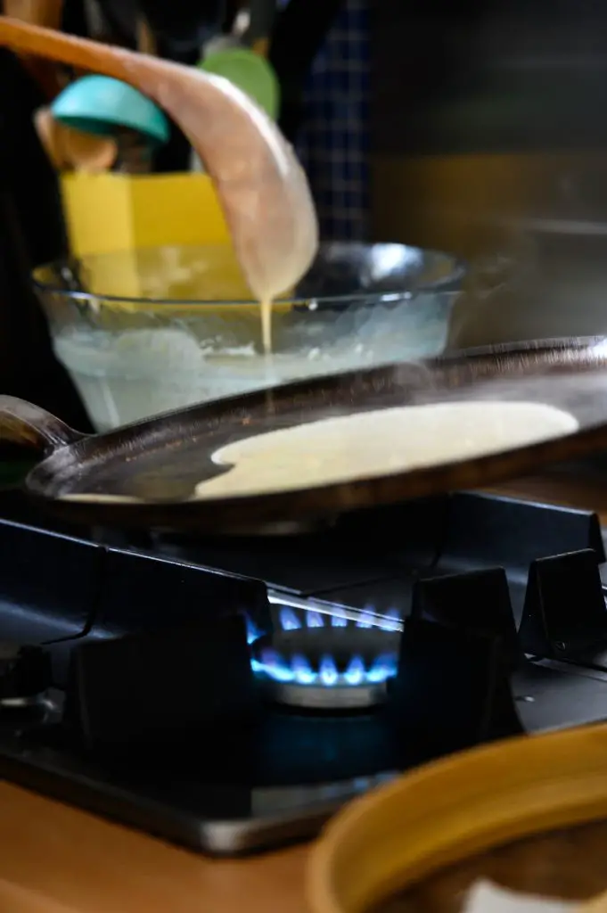 Le matériel: Utilisez une crêpière (poêle à bords bas) ou une poêle antiadhésive de bonne qualité. La poêle doit être très chaude, mais pas fumante. Si elle n’est pas assez chaude, la crêpe sera bouillie et pâle ; trop chaude, elle brûlera avant d’être cuite à cœur.