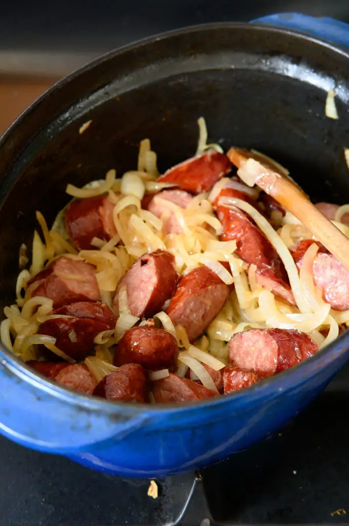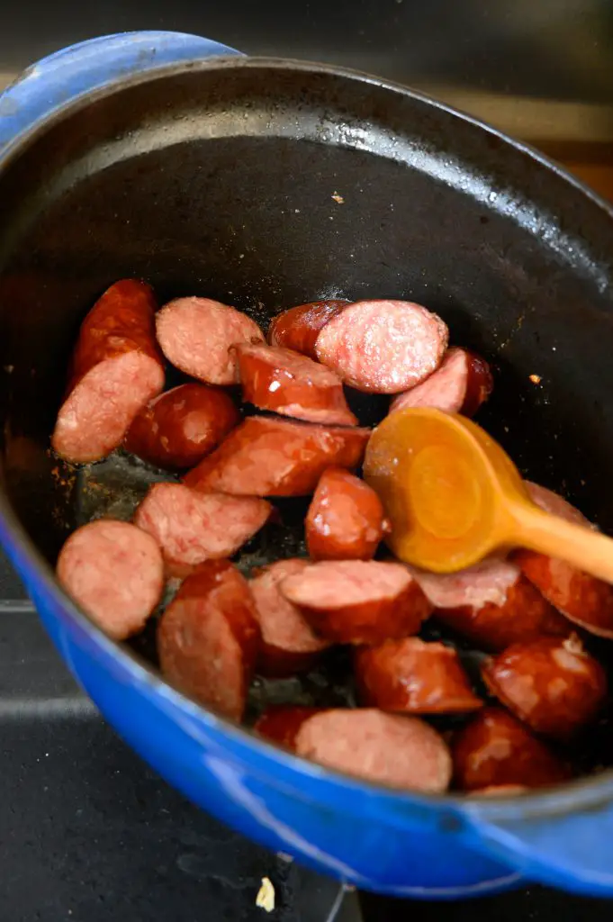 - Dans la cocotte, faites chauffe 1 c à s d'huile. Faites revenir les morceaux saucisses à feu vif jusqu’à ce qu’ils soient bien dorés.