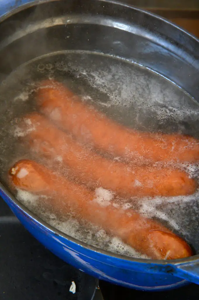 - Le blanchissage : je plonge les saucisses entières dans une marmite d’eau bouillante pendant 10 minutes. Cela retire l’excès de sel et de gras. Il faut ensuite bien les égoutter.