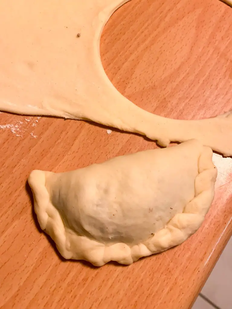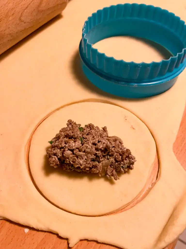 - Déposez une grosse cuillère à soupe de farce au centre de chaque disque de pâte abaissée, puis refermez en deux et appuyez sur les bords avec le dos de la pointe d’un couteau.